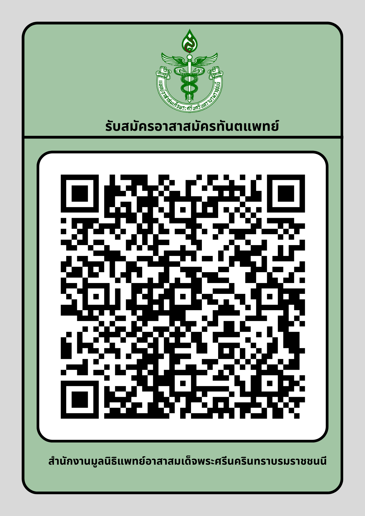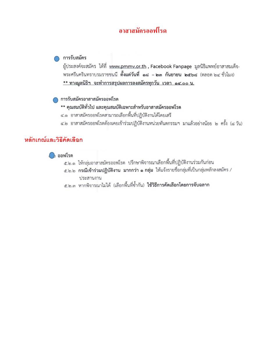 มูลนิธิแพทย์อาสาสมเด็จพระศรีนครินทราบรมราชชนนี เปิดรับสมัคร "อาสาสมัครออฟโรด เพื่อเข้าร่วมปฏิบัติงานหน่วยทันตกรรมเคลื่อนที่เพื่อประชาชนด้อยโอกาสในเขตท้องถิ่นทุรกันดาร ปี2569 โดยการ Scan QR Code ได้ตั้งแต่วันที่ 18-23 กันยายน 2568 (ตลอด24ชั่วโมง) และทางมูลนิธิฯ จะทำการสรุปผลการลงสมัครทุกวัน เวลา 14.00 น โดยทางมูลนิธิฯ จะทำการสรุปผลการลงสมัครทุกวัน เวลา 14.00 น และจะประกาศผลการคัดเลือกรายชื่ออาสาสมัครออฟโรด ในวันที่ 26 กันยายน 2568 หมายเหตุ: คุณสมบัติและหลักเกณ์และวิธีคัดเลือกอาสาออฟโรด ตามรายละเอียดแนบ